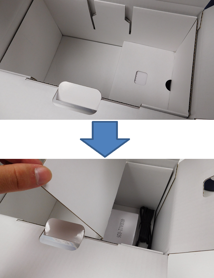 箱の中の紙蓋を持って広げ、AC電源を取り出します。