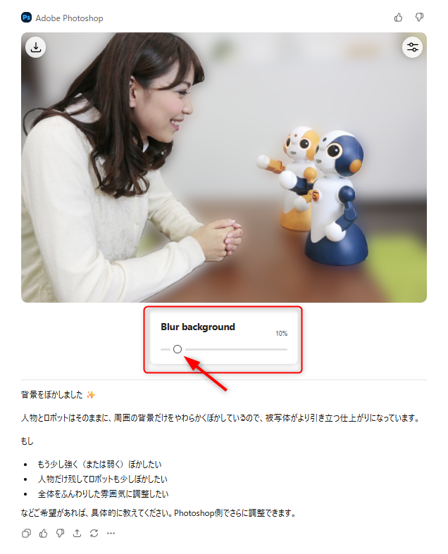 背景のぼかし、明るさ・色味の調整、被写体の切り抜きといったPhotoshopでよく使う基本的な編集は、プロンプトによる指示だけでなく、バー操作による調整も可能で、想像以上に直感的に使える印象でした。