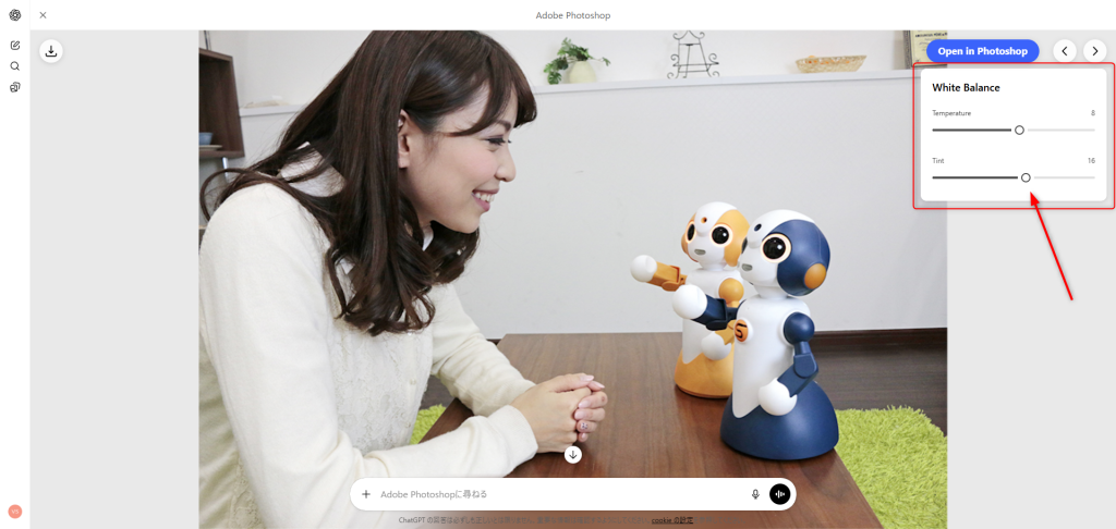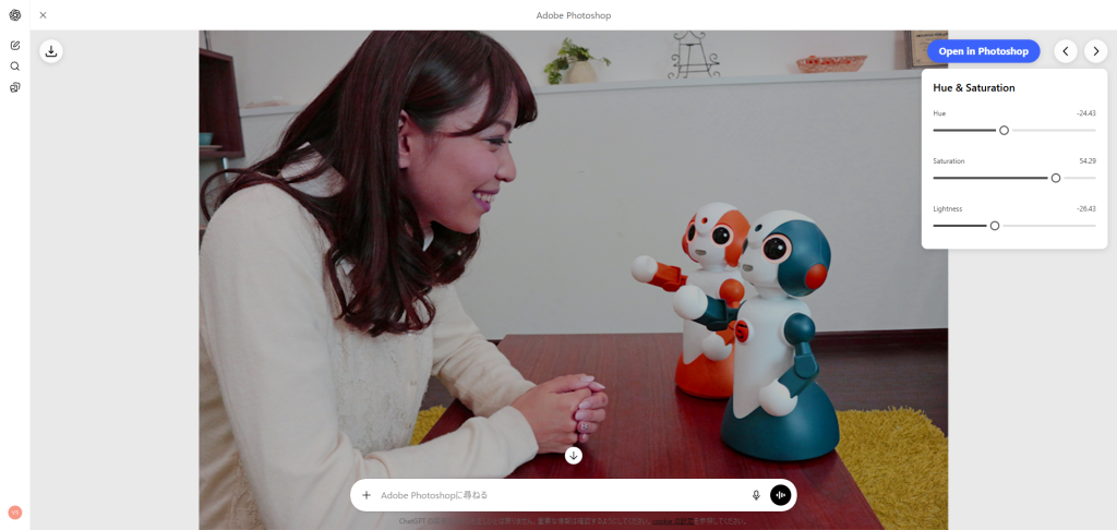 また、操作内容に応じて調整方法の異なる候補を提示してくれたり、必要に応じて 「Open in Photoshop」 ボタンからブラウザ版Photoshopへ移行できたりと、ChatGPTとPhotoshopを行き来しながら作業できる点も大きな魅力です。