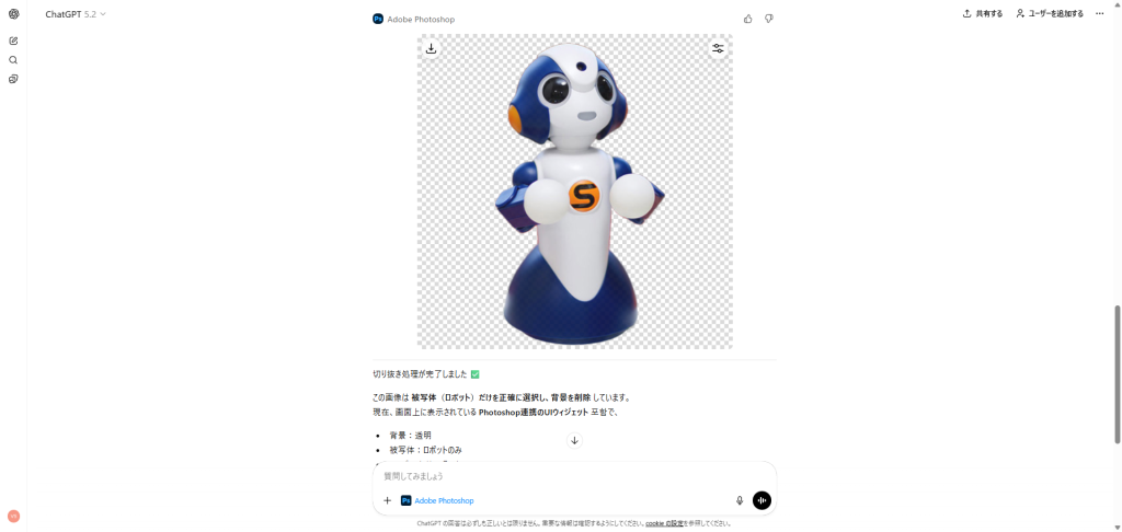 本来であれば、有料アプリであるPhotoshopの機能をChatGPTを通じて気軽に使えるのは、かなり大きなメリットだと感じました。