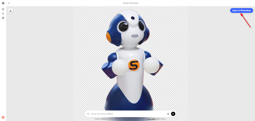 いずれの操作でも、生成された画像をクリックすると、画面右上に「Open in Photoshop」 ボタンが表示されます。このボタンをクリックすることで、ブラウザ上のPhotoshop画面に移行し、編集を続けることが可能です。