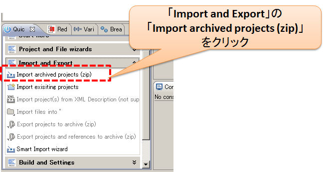LPCXpressoを起動し、画面左下の「Quickstart Panel」の「Import and Export」より