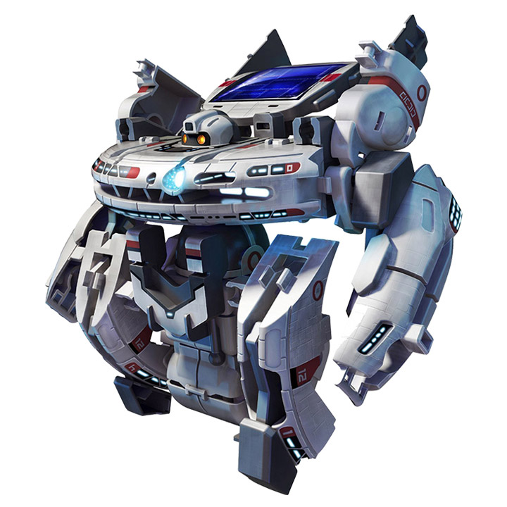 太陽の光で発電した電気をミニ充電池にため、その電気をエネルギーにかえて動くロボットキットです。 乾電池からも充電できるので、室内や夜でも動かすことができます。 また、簡単に部品が組み替えられるので、宇宙飛行士やスペースシャトルなど宇宙で活躍する7タイプのロボットや乗り物に変身させることもできます。