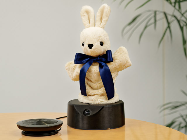 着ぐるみロボット「くるみちゃん」64bit版には、安定した音声対話を実現する目的で、USB接続のマイク内蔵スピーカーを付属しました。これにより、エコーバックなどの問題を低減しつつ、ロボットによる音声コミュニケーションを実装することが可能です。