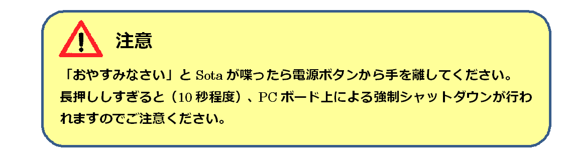 ○ボタンを3秒間程度長押しすると「おやすみなさい」という音声が再生され、シャットダウンします。正しくシャットダウンするとLEDが消灯します。